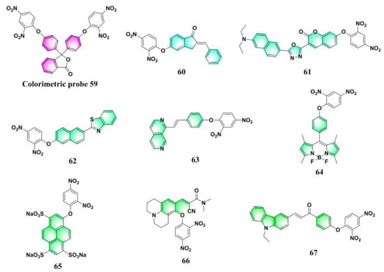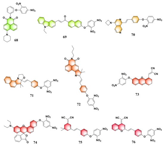 By using a well-known pH indicator, phenolphthalein, as the signaling reporter, Park and Yoon et al. reported a colorimetric probe (59) (Figure 25) for sensing PhSH [138]. Incorporation of dinitrophenyl ether into a number of other fluorophores afforded PhSH probes with different emission colors (Figure 25 and Figure 26): cyan (60 [139]), green (61 [140], 62 [141], 63 [142], 64 [143], 65 [144], 66 [145], and 67 [146]), yellow–green (68 [147] and 69 [148]), orange (70 [142]), red (71 [149], 72 [150], and 73 [151]), and near-infrared (74 [152], 75 [153], and 76 [154]).