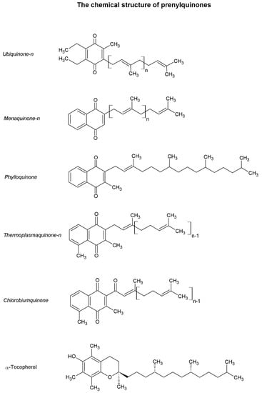 As the name implies, prenylquinones are structurally composed of an aromatic naphthoquinones or benzoquinones attached to an isoprene chain (Figure 1). The classic nomenclature classifies these substances based on their naphthoquinone/benzoquinone group (example: ubiquinone, UQ; menaquinone, MQ) and numerically indicates the number of side-chain isoprene units (UQ-n, UQn). Prenylquinones are apolar compounds that have the ability to protonate and deprotonate and, thus, most prenylquinones are involved in electron transfer reactions in the cell lipid phase. Many prenylquinones are commonly known as vitamins because these compounds are necessary components of animal dietary intake [41,42,43,44]. It seems that the first prenylquinones were MQs, which appeared in the context of a primitive atmosphere that lacked oxygen [45]. Changes in the Earth’s gaseous composition led to the appearance of UQs among other prenylquinones [45]. Currently, many different prenylquinones exist in nature that, because of their chemical characteristics, are capable of developing specific activities in each organism. Among others, the prenylquinone group includes UQs, plastoquinones (PQs), plastocromanol, MQs, phylloquinone (PK), tocopherol, rhodoquinones, chlorobiumquinone (ChQ), and thermoplasmaquinone (TpQ) [45]. Each substance presents a different polarity and redox potential, which determines the cellular location of the compound and the ability of the compound to protonate and deprotonate at different oxygen saturations [45,46]. The isoprenic chain size has also been shown to influence catalytic activity, activation energy, and kinetics among other chemical characteristics [46].