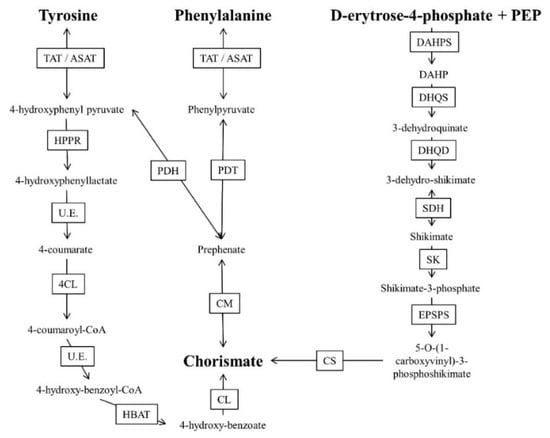 Scheme of chorismate synthesis from aromatic amino acids (tyrosine and phenylalanine) or the shikimate pathway. DAHP; PEP; TAT/ASAT (EC 2.6.1.5); HRPR (EC 1.1.1.237); U.E. (uncharacterized enzyme); 4CL (EC 6.2.1.12); HBAT (EC 3.1.2.23); CL (EC 4.1.3.40); PDH (EC 1.3.1.12/1.3.1.13); PDT (EC 4.2.1.51); CM (EC 5.4.99.5); DAHPS (EC 2.5.1.54); DHQS (EC 4.2.3.4); DHQD (EC 4.2.1.10); SDH (EC 1.1.1.25/1.1.5.8/1.1.1.282); SK (EC 2.7.1.71); EPSPS (EC 2.5.1.19); CS (EC 4.2.3.5). Based on information from Kyoto Encyclopedia of Genes and Genomes database [87].
