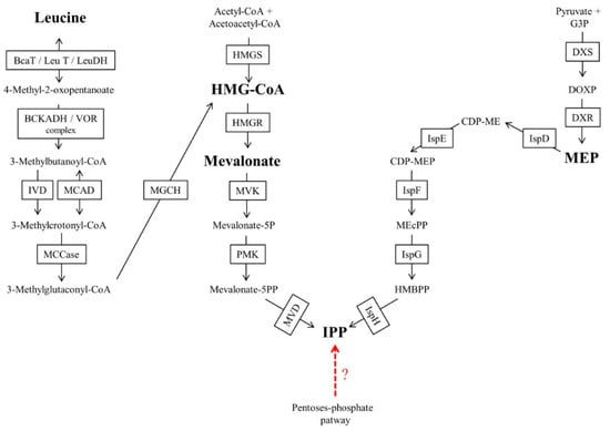 In Leishmania and Trypanosoma species, indicators of leucine dependent pathways were observed for isoprenoid biosynthesis [70,71,102]. These pathways can be independent of the MVA pathway or coupled to the MVA pathway with or without conversion of leucine to acetyl-CoA for 3-hydroxy-3-methyl-glutaryl-CoA (HMG-CoA) regeneration [70,71,102]. In the case of the MVA-coupled pathway without the conversion of leucine to acetyl-CoA, leucine can be reduced to HMG-CoA in T. brucei. Alternatively, the MVA pathway-independent incorporation of leucine into isoprenoids, an intermediate step in leucine breakdown (probably to dimethylcrotonyl-CoA), could be directly reduced to produce isopentenol in Leishmania mexicana [70]. The incorporation of leucine to isoprenic chains without the conversion of leucine to acetyl-CoA has also been demonstrated in other widely divergent organisms, such as halophilic archaea [78].