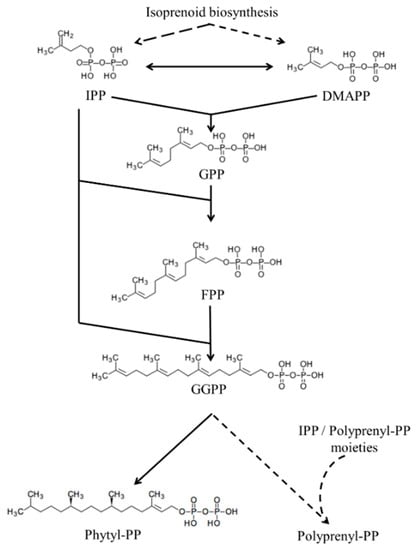 Regardless of the isoprenoid biosynthetic pathway, IPP and DMAPP can be transformed to their respective isomers by the action of an IPP isomerase [96]. The isomerization of IPP and DMAPP and subsequent elongation of isoprenic chains seems to occur in most living organisms [96,118] (Figure 1). The simplest elongation occurs by condensation of the IPP molecule and DMAPP to form geranyl pyrophosphate (GPP) by the enzyme GGP synthase. Subsequently, GPP can be condensed with another IPP molecule to form FPP by the enzyme FPP synthase. If FPP is condensed with IPP once again, geranylgeranyl pyrophosphate (GGPP) is formed, a reaction catalyzed by the enzyme GGPP synthase. This elongation process can continue for the formation of chains of different sizes [119,120,121,122]. For example, chains of nine isoprenic units (solanesyl pyrophosphate) can be formed for UQ-9 biosynthesis.