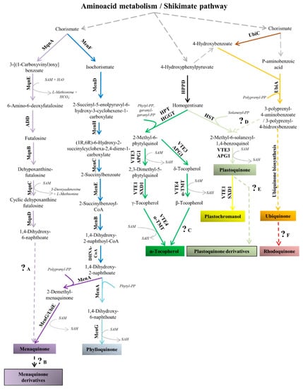 The aromatic precursor of UQ, p-hydroxybenzoate, is formed from chorismate via the shikimate pathway in most bacteria and plants, while in eukaryotes, p-hydroxybenzoate is provided by tyrosine [45]. The conversion of chorismate to p-hydroxybenzoate is catalyzed by the enzyme chorismate-pyruvate lyase, encoded by the ubiC gene [45]. In the biosynthetic pathway in most organisms, p-hydroxybenzoate is prenylated by the p-hydroxybenzoate polyprenyltransferase enzyme (UbiA/Coq2), followed by modification of the prenylquinone head group (Figure 7). These modifications are performed by Ubi/Coq, but the enzymatic reaction order can differ among species. However, in all organisms, decarboxylation, hydroxylation and SAM-dependent methylation occur.