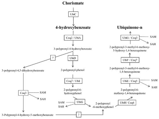 Scheme of ubiquinone biosynthesis. UQ biosynthesis from 4-hydroxybenzoate. In the figure depicting the metabolic pathways, the transformation of the cofactor SAM to S-adenosyl-l-homocysteine (SAH) for methylation is indicated. UbiC. Chorismate-pyruvate lyase, EC: 4.1.3.40; UbiA/Coq2. EC: 4-Hydroxybenzoate polyprenyltransferase, 2.5.1.39; UbiD. 4-Hydroxy-3-polyprenylbenzoate decarboxylase, EC: 4.1.1.98; Coq7/UbiI. 2-Polyprenylphenol 6-hydroxylase, EC: 1.14.13.240; UbiH/Coq6. UQ biosynthesis monooxygenase/2-octaprenyl-6-methoxyphenol hydroxylase, EC: 1.14.13.-; UbiE/Coq5. 2-Methoxy-6-polyprenyl-1,4-benzoquinol methylase, EC: 2.1.1.201; UbiF/Coq7. 3-Demethoxyubiquinol 3-hydroxylase, EC: 1.14.99.60; UbiG/Coq3. Polyprenyldihydroxybenzoate methyltransferase/3-demethylubiquinol, 3-O-methyltransferase/2-polyprenyl-6-hydroxyphenyl methylase/3-demethylubiquinone-9 3-methyltransferase, EC: 2.1.1.114/2.1.1.64/2.1.1.222/. Data from the Kyoto Encyclopedia of Genes and Genomes database [87].