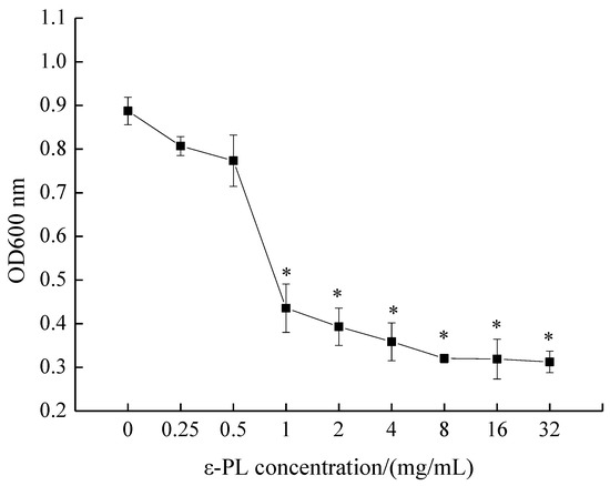 The MIC of ε-PL against S. putrefaciens was measured by conventional broth dilution assay, as depicted in Figure 1. OD600 nm values decreased with an increase in ε-PL concentration, and the MIC of ε-PL against S. putrefaciens was found to be 1.0 mg/mL. Moreover, the inhibitory effect of ε-PL against S. putrefaciens was positively correlated with the concentration of ε-PL.