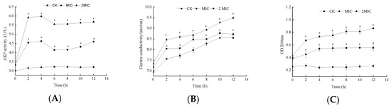 As illustrated in Figure 3A, in the absence of ε-PL, AKP activity was maintained at 3.20 U/L. After treatment with MIC and 2 MIC ε-PL for 2 h, the AKP activity increased from 3.32 to 4.54 U/L and from 3.32 to 5.91 U/L, respectively. Obviously, the AKP activity from S. putrefaciens cells increased with an increase of ε-PL concentration (from MIC to 2 MIC). It has previously been reported that ε-PL induces cell wall damage, leading to AKP leakage from cells with the loss of cytoderm integrity [19]. Additionally, ε-PL can enter the inner membrane and lower the activity of AKP in S. putrefaciens, thus inhibiting bacterial growth. The decreased activity of AKP treated with ε-PL may prevent dephosphorylation progress, thereby inhibiting energy metabolism [15].