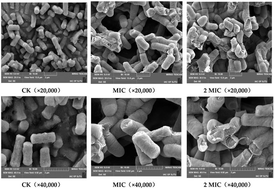 As seen in Figure 4, the bacterial cells of S. putrefaciens without ε-PL had a regular, short-bar-shaped morphology, with a smooth and intact cell surface. Furthermore, the surface appeared full and glossy. In contrast to the control, S. putrefaciens cells treated with ε-PL (MIC and 2 MIC) were deformed, shriveled, pitted and swelled, with parts of the cell appearing broken and shrunk to a smaller size.