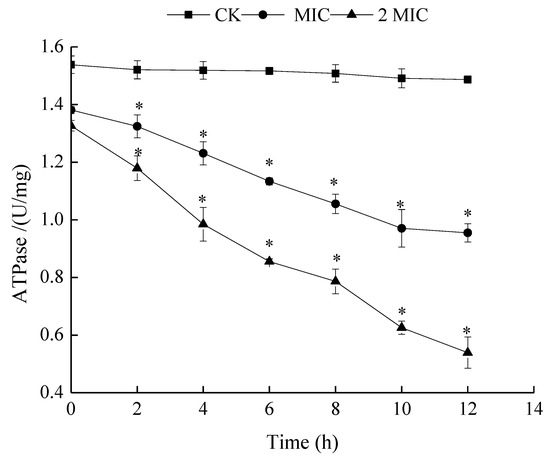 Effects of ε-PL against on ATPase activity of S. putrefaciens. Bars represent the standard error of the means. The superscript (*) indicates a result that is significantly different to the equivalent control point (t test, p < 0.05).