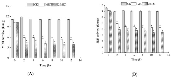 Effects of ε-PL on malicdehydrogenase (MDH) (A) and succinodehydrogenase (SDH) (B) activity of S. putrefaciens. Bars represent the standard error of the means. The superscript (*) indicates a result that is significantly different to the equivalent control point (t test, p < 0.05).