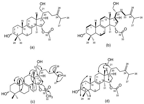Camphoratin K (1) was isolated as a white powder, and its sodiated molecular formula, C33H54O4Na, was established from a sodium adduct ion peak at m/z 537.3917 in high-resolution electrospray ionization mass spectrometric (HR-ESI–MS) analysis. The infrared (IR) absorption bands at 3427, 1714, 1643, 1455, and 891 cm−1 were in agreement with the presence of a hydroxyl group, an ester, and a terminal double bond. In its 1H-NMR spectrum, there were proton signals for five methyl singlets at δ 0.80 (6H, s, CH3-18, 29), 0.97 (3H, s, CH3-19), 0.99 (3H, s, CH3-30), 1.01 (3H, s, CH3-31), 2.04 (3H, s, CH3-33), two methyl doublets at δ 1.01 (3H, d, J = 6.8 Hz, CH3-27) and 1.02 (3H, d, J = 6.8 Hz, CH3-26), and four protons at δ 2.22 (1H, sept, J = 6.8 Hz, H-25), 3.22 (1H, dd, J = 4.4 Hz, 11.6 Hz, H-3), 3.69 (2H, m, H-21), 5.05 (1H, dd, J = 5.8, 9.4 Hz, H-15). The 13C-, DEPT- and HMQC NMR spectra showed 33 carbon signals composed of 8 methyls at δ 15.4, 16.4, 18.3, 19.1, 21.4, 21.8, 21.9, 28.0; 9 methylenes at δ 18.2, 20.8, 26.4, 27.7, 28.2, 30.6, 31.4, 35.5, 36.0; 1 oxygenated methylene at δ 62.0; 2 oxygenated methines at δ 76.0, 78.9, and 1 terminal olefinic carbon at δ 106.4, which indicated a triterpene skeleton. An acetyl group was assigned to link to C-15 from HMBC spectral correlations of H-15 (δ 5.05) to C-16 (δ 36.0) and C-32 (δ 171.1). A terminal olefinic group and an isopropyl group were built up via 2J, 3J-HMBC correlations of CH3-26 (δ 1.02) to C-24 (δ 156.1), C-25 (δ 33.7), and C-27 (δ 21.9) and H-28 (δ 4.73 and 4.67) to C-23 (δ 31.4), C-24 (δ 156.1), and C-25 (δ 33.7). Other HMBC correlations indicated a sulphurenic acid skeleton with a hydroxyl methylene [H-21 (δ 3.69) to C-17 (δ28.0)/C-20 (δ 43.2)] instead of an acid connected to C-20. This C-21 hydroxyl substitution is novel and rare among all isolates from T. camphoratus (Figure 1).