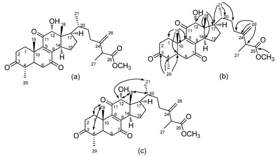 Camphoratin N (2) appeared as a pale yellow solid with sodiated molecular formula C30H42O6Na (m/z 521.2876). The presence of an 8(9)-ene-7,11-dione moiety was proposed along with those of a carboxyl group and a hydroxyl group, according to a UV maximum at 267 nm and IR absorptions at 3495, 1736, 1713, 1674, 1458, and 901 cm−1, respectively. Comparison of its 13C-NMR data with those of antcamphin I [18] indicated the presence of an additional oxygenated methyl group. Assignment of the oxygenated methyl group attached to a terminal carboxylate was based on the HMBC correlation of CH3-26 (δ 3.67) to C-26 (δ 175.0). Also, 12α-OH and 29α-CH3 were suggested via the NOE enhancements of H-12 (δ 4.11)/CH3-18 (δ 0.67) and CH3-19 (δ 1.54)/H-4 (δ 2.43) (Figure 2). According to a previous study, camphoratin N could include a pair of epimers (25 S/R) that have identical NMR data [18].