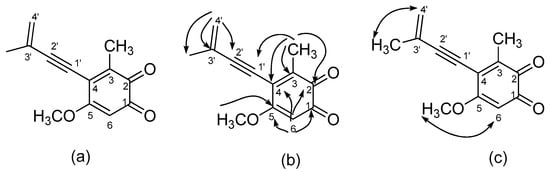 Benzocamphorin G (3), a colorless syrup, was isolated via thin-layer chromatography and has the pseudomolecular formula of C13H12O3Na, constructed from the sodiated peak at m/z 239.0686 in HR-ESI–MS analysis. Characteristic absorption bands in its IR spectrum revealed alkynes (2205 cm−1), conjugated carbonyls (1667 cm−1), and alkenes (1607 cm−1). UV absorption maxima were at 268 and 296 nm. A comparison of its NMR spectra data with those of antrocamphin A [18] indicated similar proton peaks at δ 5.44 (1H, s, terminal alkene), 5.55 (1H, s, terminal alkene), 3.82 (3H, s, OCH3), 2.22 (3H, s, CH3-3), and 2.01 (3H, s, CH3-3′) as well as downfield shift of one aromatic proton (δ 5.99, 1H, s, H-6) and loss of two methoxy signals. 13C- and DEPT-135 NMR spectra revealed a similar pattern to that of antrocamphin A, except for a pair of ortho-carbonyls (δ 181.1 and 181.3), a downfield shift of C-6 (δ 107.0), and a loss of two methyl carbons. The positions of the ortho-carbonyls were assigned to be at C-1 and C-2 via HMBC correlations of H-6 (δ 5.90)/ with C-1 (δ 183.1), with C-2 (δ 181.3), with C-4 (δ 129.4), with C-5 (δ 158.8); and of CH3-3 (δ 2.22) with C-2 (δ 181.3), with C-3 (δ 144.6), with C-4 (δ 129.4), with C-1′ (δ 81.7), respectively. Therefore, the structure of benzocamphorin G was established and is shown in Figure 3.