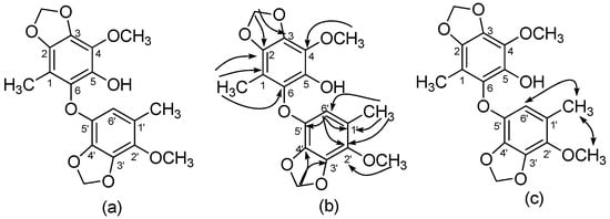 Benzocamphorin I (4) was also isolated via thin-layer chromatography as colorless syrup. HR-ESI–MS analysis indicated its pseudomolecular formula as C18H18O8Na (m/z 385.0898). No alkynes and alkene characteristic peaks were detected in its IR spectrum. Three pairs of proton signals revealed two methyls (δ 1.99, 2.05), two methylenedioxy groups (δ 5.98, 6.00), and two methoxys (δ 3.89, 3.90). Further 13C-, DEPT, and HSQC spectra indicated a benzocamphorin D skeleton [19] with an oxygen linkage between two phenyl groups. However, one methoxy signal was lacking, and an oxygenated aromatic carbon was present compared to benzocamphorin D [19], showing the methoxy group was replaced by a hydroxyl group. Thus, the structure of benzocamphorin I was determined and is shown in Figure 4.
