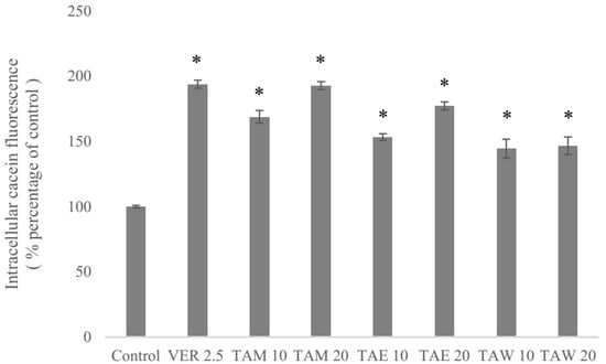 The inhibitory effects of the methanol extract at 10 and 20 μM concentrations (TAM 10, TAM 20), the EtOAc layer (TAE 10, TAE 20), the water layer (TAW 10, TAW 20) and verapamil at 2.5 μM concentration (VER 2.5) on P-glycoprotein (P-gp) in ABCB1/Flp-InTM-293 cells. * denotes p < 0.05 compared with the intracellular calcein fluorescence in the control group. The numbers, 2.5, 10, 20, indicate the μM concentrations.