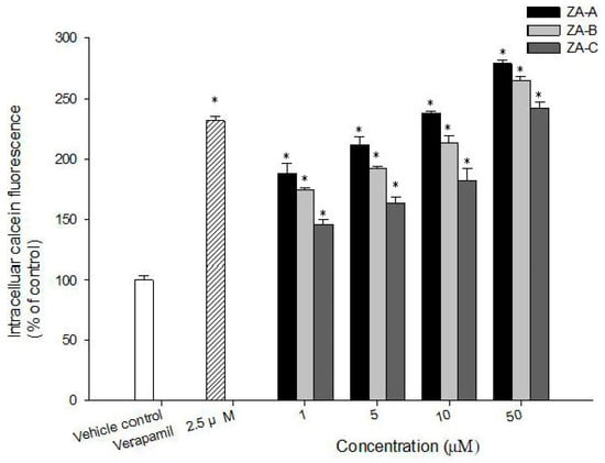 The concentration-dependent inhibitory effects of zhankuic acids (ZAs) A, B, C on P-gp in ABCB1/Flp-InTM-293 cells. * denotes p < 0.05 compared with the intracellular calcein fluorescence in control group.