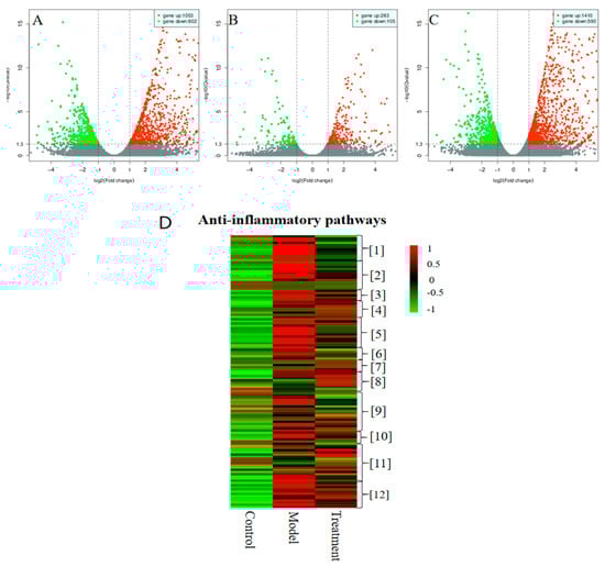 Distinct transcriptome profile obtained upon treating RAW 264.7 macrophages with chlojaponilactone B (1), as determined by RNA-seq. Horizontal coordinates represent variations in mRNA expression levels, and longitudinal coordinates represent significant changes in mRNA expression levels. Red and green dots in the Volcano plot indicate mRNAs with increased and decreased expression levels, respectively. Red and green squares in the Heat map indicate mRNAs with increased and decreased expression levels, respectively (see color scale). RAW 264.7 macrophages treated with LPS (1 μg/mL) for 24 h served as the model group and those treated with 1 (3.5 μM) and LPS (1 μg/mL) served for 24 h as the treatment group. Cells cultured with 0.05% DMSO for 24 h served as the control group. (A) Control group vs. model group. (B) Model group vs. treatment group. (C) Control group vs. treatment group. (D) Heat map analysis of anti-inflammatory pathway profiles for the three groups. Three independent experiments were performed for each group, followed by data analyses.