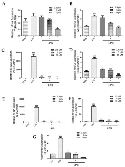 Effects of 1 on the expression of (A) TLR4, (B) MyD88, (C) iNOS, (D) COX-2, (E) IL-6, (F) TNF-α and (G) NF-κB. RAW 264.7 cells were incubated with the indicated concentrations of 1 (2.5, 5 or 10 μM) and LPS (1 μg/mL) for 24 h, as determined by RT-PCR assay. GAPDH was used as the internal control. Values are representative of three independent experiments. ## p < 0.01, ### p < 0.005 vs. control cells. * p < 0.05, ** p < 0.01, *** p < 0.005 vs. LPS-induced cells.