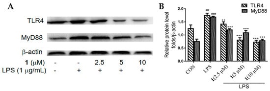 To further explore whether 1 influenced inflammatory receptors at the protein level, we performed Western blotting to determine the levels of TLR4 and MyD88 in LPS-induced RAW 264.7 macrophages after treating with 1. The enhanced levels of TLR4 and MyD88 on the stimulation of LPS were decreased by treatment of 1 in a dose-dependent manner (p < 0.01) (Figure 3).