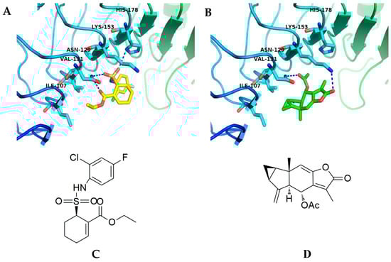 TAK-242 is a specific, small-molecule inhibitor of the intracellular signaling pathways of TLR4, and it limits NF-κB-mediated pro-inflammatory cytokines generation [17]. To explore the inhibitory mechanism of 1 or TAK-242 against TLR4, we performed molecular docking studies to predict the binding patterns of 1 or TAK-242 with TLR4. The calculated binding affinity of 1 (-CDOCKER_INTERACTION_ENERGY = 22.3062) was approximate to that of TAK-242 (-CDOCKER_INTERACTION_ENERGY = 24.7947). As shown in Figure 4, TAK-242 formed three hydrogen bonds with Asn129 and His178, while 1 formed two hydrogen bonds with Asn129 and Lys153 in the β-sheet in the binding sites of the TLR4 protein. Results of molecular docking studies clearly indicated that 1 interacts with TLR4 via hydrogen bonds formed with the acetyl and carbonyl groups, while TAK-242 formed hydrogen bonds with TLR4 via the acyl and sulfonic groups.
