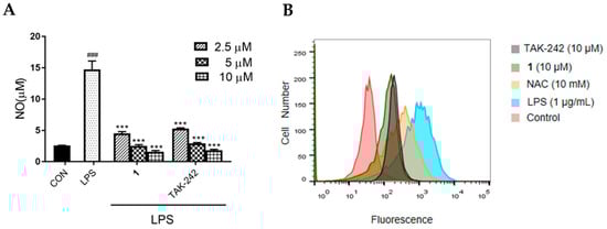 Effect of 1 on NO and ROS production in LPS-induced RAW 264.7 macrophages. (A) NO and (B) ROS was measured using the Griess systems and flow cytometry, respectively. For NO measurement, cells were incubated with varied concentrations of 1 (2.5, 5 or 10 μM) or TAK-242 (2.5, 5 or 10 μM) and treated with LPS (1 μg/mL) for 24 h. For ROS determination, cells were incubated with 1 (10 μM), TAK-242 (10 μM) or NAC (10 mM) and treated with LPS (1 μg/mL) for 24 h. Results are representative of three independent experiments. ### p < 0.005 vs. control cells, *** p < 0.005 vs. LPS-induced cells.