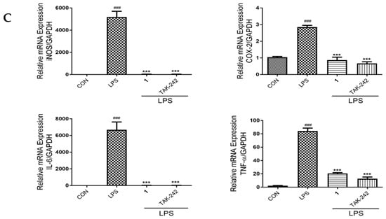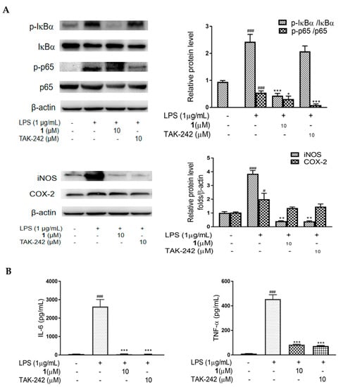 Effect of 1 on phosphorylation of NF-κB subunits, and the expression of pro-inflammatory cytokines in LPS-induced RAW 264.7 macrophages. Cells were incubated with 1 (10 μM) or TAK-242 (10 μM) and LPS (1 μg/mL) for 24 h. (A) Western blotting was performed to detect the expression of IκBα, p-IκBα, p65, p-p65, iNOS and COX-2. β-Actin served as the internal control. Quantification of immunoreactive protein bands is shown via bar graphs. (B) ELISA was determined to measure the production of IL-6 and TNF-α. (C) RT-PCR was performed to detect the mRNA levels of iNOS, COX-2, IL-6 and TNF-α. GAPDH was used as the internal control. Values are representative of three independent experiments. # p < 0.05, ### p < 0.005 vs. control cells. * p < 0.05, ** p < 0.01, *** p < 0.005 vs. LPS-induced cells.