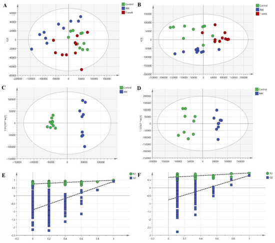 Multivariate statistical analysis of control group, AAΙ group, one-week group in serum and liver samples. (A) principal components analysis (PCA) scores plot of three groups in serum. (B) PCA scores plot of three groups in liver. (C) orthogonal projections to latent structures discriminant analysis (OPLS-DA) scores scatter plot in serum. (D) OPLS-DA scores scatter plot in liver. (E) OPLS-DA validation plot in serum. (F) OPLS-DA validation plot in liver.