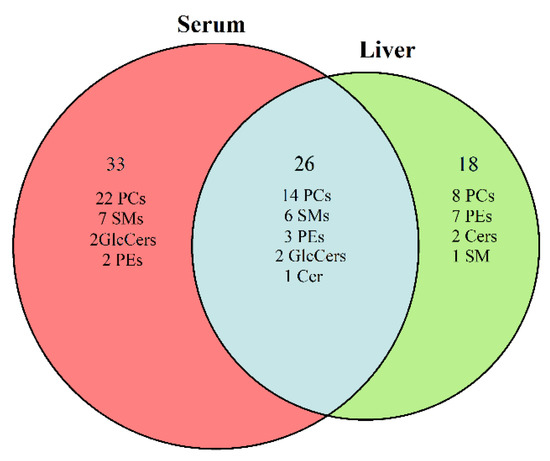 Venn diagram. Each circle represented the potential lipid markers based on the comparisons of the AAΙ group versus the control group in serum and liver, respectively.