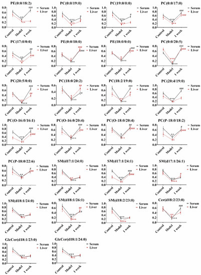 The tendency of level variation of significantly differentially expressed lipids in both liver and serum in the control group, AAΙ group, and one-week group. * P < 0.05, ** P < 0.01, and *** P < 0.001, the control group compared to the AAΙ group. # P < 0.05, ## P < 0.01, and ### P < 0.001, the one-week group compared to the control group.