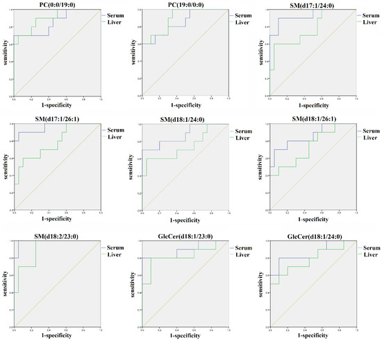 Receiver operating characteristic (ROC) curves of nine out of 26 common lipids from the control group, AAΙ group, and one-week group based on OPLS-DA analysis. The associated AUC, specificity, and sensitivity values of five SMs, two PCs, and two GlcCers were exhibited.