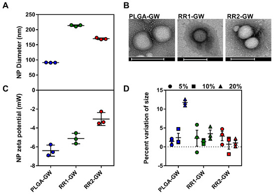 Upon synthesis, NPs were purified and characterized for their size, surface charge, and GW encapsulation efficiency. The hydrodynamic size measurement of NPs by both Dynamic Light Scattering (DLS) and ZetaView particles tracking indicated that the size was approximately 100–200 nm for all particles with narrow size distributions (Figure S2A,B, and Figure 2A). All NPs were spherical in shape as shown by transmission electron microscopy imaging (Figure 2B) and had slightly less size due to the lack of the solvent hydration layer. All NPs also had a slightly negative surface charge with zeta potential values ranging from −3 to −7 mVs (Figure 2C). The encapsulation efficiencies of GW were determined by HPLC analysis of NPs, and were within the range of typical drug encapsulation, with 60–85% encapsulation efficiency [12,13,14]. The redox active NPs RR1-GW and RR2-GW encapsulated 67% and 85% of the original GW feed, and PLGA-GW NPs encapsulated 80% of GW in the NPs. We next explored the stability of NPs by incubating them in differing percentages of fetal bovine serum (FBS) at 37 °C, to mimic physiological conditions. All NPs were stable within these mimicking conditions (Figure 2D). Finally, no differences in in vitro release profiles were observed between NP formulations (Figure S2C).