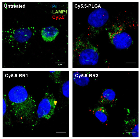 In order to compare the effects of LXR activation by different NPs in a cellular system, we first studied if primary murine macrophages took up NPs at a similar rate. To this end, we developed NPs tagged with Cy5.5 dye by chemically conjugating Cy5.5 to the polymer. The Cy5.5-PLGA, Cy5.5-RR1 and Cy5.5-RR2 NPs were then analyzed by ZetaView to obtain NPs particle concentration in the solution. Cells were treated with Cy5.5-NPs in similar particle concentrations for 90 min, fixed and analyzed by flow cytometry to identify cells that had accumulated NPs. Our results indicated that the three NP formulations were taken up by macrophages at a similar rate (data not shown). Cells were also imaged by confocal microscopy with co-staining for LAMP1, a lysosomal marker. Consistent with the flow cytometry analyses, imaging determined that the uptake between the various NPs was similar (Figure 3).