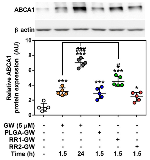 ABCA1 protein expression is upregulated with RR1-GW nanoparticle treatment. WT BMDM were treated with nanoparticles encapsulating 5 µM GW-3965 for 1.5 h. ABCA1 protein was measured 24 h post-treatment and normalized to ß actin. Data represent mean ± SEM where *** p < 0.001 and * p < 0.05 are differences compared with vehicle control, while ### p < 0.001 and # p < 0.05 is compared to acute GW-3965 dose determined by one-way ANOVA (n = 5).