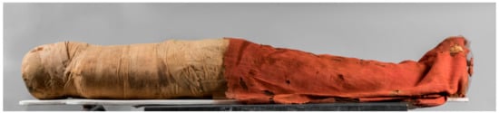 - Corcoran, L.H. Portraits Mummies from Roman Egypt (I-IV centuries AD) with a Catalog of Portraits Mummies in Egyptian Museums; Oriental Institute of the University of Chicago: Chicago, IL, USA, 1995; pp. 55–57. [Google Scholar]