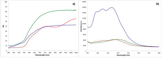 p-FL spectra performed on selected textiles (Table 2) further supported the identifications obtained by FORS. The textiles dyed with red safflower showed a characteristic intense emission band at ca. 570 nm [], whereas madder produced a characteristic spectrum with an intense emission band at ca. 600 nm []. Fluorimetry was not conclusive for the identification of the red ochre. Representative FORS and p-FL spectra for the above-described scenarios are reported in Figure 2.