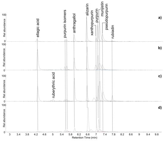 Extract ion chromatograms of the molecular components of madder (Rubia spp.)—alizarin and xanthopurpurin [M-H]− = 239.035 m/z; rubiadin [M-H]− = 253.051 m/z; purpurin and anthragallol [M-H]− = 255.031 m/z; munjistin [M-H]− = 283.025 m/z; pseudopurpurin [M-H]− = 299.020 m/z; ruberythric acid [M-H]− = 563.1406 m/z—and tannin-related compound—ellagic acid [M-H]− = 300.999 m/z—obtained by HPLC-ESI-Q-ToF analysis (negative mode) of (a) ME2, (b) BM2, (c) BM4, and (d) BM5.