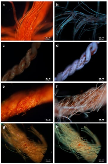 All the samples dyed with safflower exhibited a more limited number of smaller (10–20 µm) coloured particles with respect to the madder-containing ones, and a general pink/orange hue was observed throughout some of the fibres in the vis-OM images (Figure 5g). The particles and the fibres produced luminescence under UV illumination from bright to less intense orange (Figure 5h), following the extent of fading, as is typical of safflower [].