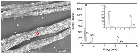 EDS analyses of samples BM1 and ME7 confirmed the presence of a fine dispersion of Fe-rich particles, which appeared bright in the back scattered electron images (Figure 7). In all the spectra recorded from these particles, Al, Si, and Ca were also detected, possibly pointing to a siliceous component. These elements were also detected in other particles poorer in Fe, suggesting the use of very fine ochreous earths for colouring the textile.