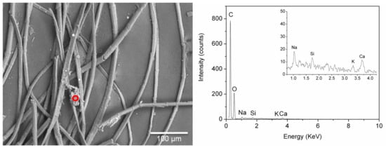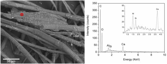 Regarding the samples dyed with madder, many spot analyses were performed on the madder-rich structures (Figure 8). Attention was paid to focus the beam only on the coloured aggregates, excluding the areas in which other particles were evident. Unfortunately, this was not possible for sample BM5, where the fibres were heavily contaminated. Therefore, elemental data for this sample will not be considered further. On the other hand, the analyses performed on the other three samples dyed with madder—ME2, BM2, BM4—produced useful qualitative information. The results were generally characterised by relatively low—and highly variable—peak intensities for all the detected elements, except for C and O, thus suggesting a mostly organic composition (Figure 8). Very reproducible spectra were obtained on areas of the fibres showing no evident contamination, where only intense peaks of C and O were detected (not shown). The analyses on the red agglomerates enabled Al, Si, and Ca to be detected in all the considered spots (Figure 8, inset) and P in most of them. In a few cases (not reported), S, Cl, and K were also detected in the EDS spectra.