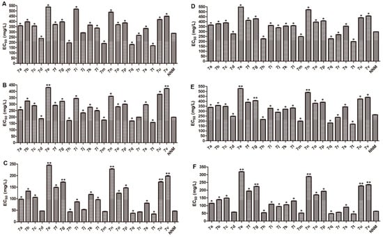 4.4.2. Curative Activity of the Target Compounds against TMV In Vivo