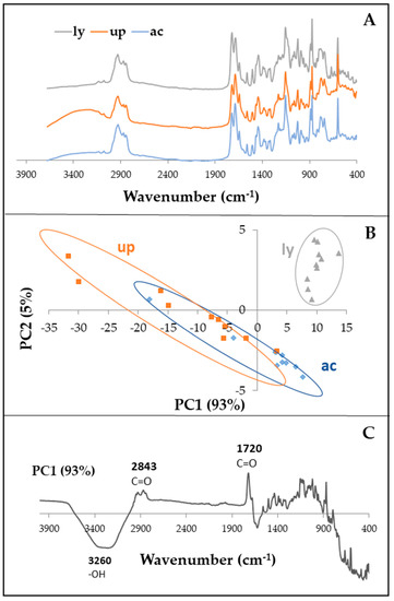 Effects of treatment on resin collected in summer from Sciadopitys verticillata: (A) Fourier transform infrared (FTIR) spectra of lyophilized (ly; grey), unprocessed (up; orange), and autoclaved (ac; blue) resin. (B) Scores plot of the first two principal components obtained by principal component analysis (PCA) of the FTIR spectra of lyophilized (grey triangles), unprocessed (orange squares), autoclaved (blue circles), and Sciadopitys verticillata (Sv) resin. (C) Loadings plot of PC1.