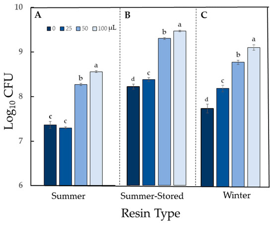 Growth stimulation of Pseudomonas fluorescens with autoclaved Sv resin: (A) Resin collected in summer and evaluated within 72 h. (B) Resin collected in summer and stored at –20 °C for 6 months before evaluation. (C) Resin collected in winter and evaluated within 72 h. Treatment doses (0, 25, 50, and 100) are volumes of suspended resin (μL) in a total volume of 300 μL. For each resin type, bars with the same letter are not different according to Tukey’s test at P < 0.0001. Data shown are arithmetic means + standard errors.