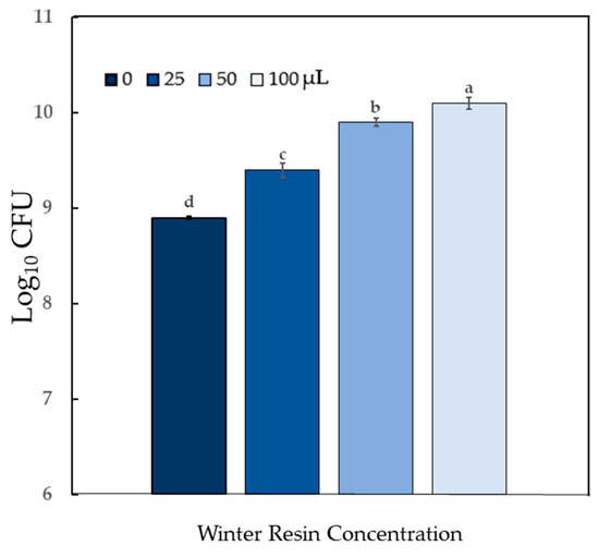 Summer and Winter resins were evaluated for impact on bacterial populations for all seven bacteria listed in Table 2. Activity of resins was classified based on antimicrobial effectiveness tests [14]. Activity was categorized into three levels based on the degree of difference (x) between the response of the no-resin control and that of the 50 μL dose of resin suspension: