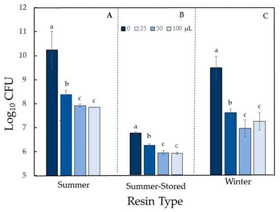 Antimicrobial activity of autoclaved Sv resin against Erwinia amylovora. (A) Resin collected in summer and evaluated within 72 h. (B) Resin collected in summer and stored at –20 °C for 6 months before evaluation. (C) Resin collected in winter and evaluated within 72 h. Treatment doses (0, 25, 50, and 100) are volumes of suspended resin (μL) in 300 μL. For each resin type, bars appearing with the same letter are not different according to Tukey’s test (P < 0.05). Data shown are arithmetic means + standard errors.