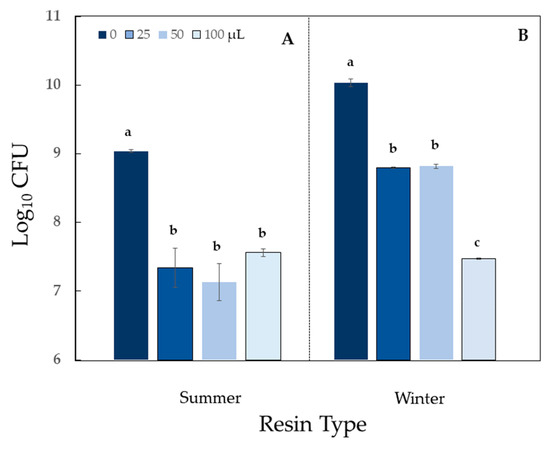 Antimicrobial activity of autoclaved Sv resin against Bacillus cereus. Resins collected in (A) summer or (B) in winter were tested within 72 h. Treatment doses (0, 25, 50, and 100) are volumes of suspended resin (μL) in 300 μL. For each resin type, bars appearing with the same letter are not different according to Tukey’s test (P < 0.05). Data shown are arithmetic means + standard errors.
