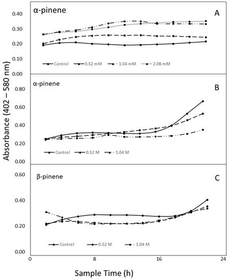 Changes in absorbance of Bacillus cereus cultures exposed to pinenes. (A) Concentrations of α-pinene lower than or equal to estimates of α-pinene concentration in Sv resin. (B) Concentrations of α-pinene of up to 1000 times greater than estimates of α-pinene concentration in Sv resin. (C) Concentrations of β-pinene up to 1000 times greater than estimates of α-pinene concentration in Sv resin. Wide-band filter (402–580) was used to measure turbidity increase associated with growth of bacterial cultures.