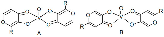 Vanadium plays different roles in biological systems [1] and shows a variety of pharmacological properties in humans [2,3], even if it is not an essential metal ion [4]. In particular, vanadyl salts and vanadyl coordination compounds exhibit insulin-mimetic activity and may be good candidates for the treatment of type II diabetes mellitus [3]. Bis(maltolato)oxovanadium(IV) (BMOV) and bis(ethylmaltolato)oxovanadium(IV) (BEOV) have undergone extensive pre-clinical testing, and BEOV has been promoted to Phase II clinical trials [5,6]. These coordination compounds show a peculiar structure where two 3-hydroxy-4-pyrone units are linked in the equatorial plane of the vanadyl cation coordination sphere, as shown in Figure 1A [7].