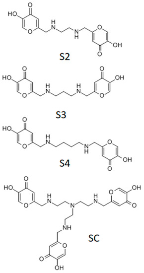 Molecular structure of the ka derivatives studied. S2: [ethane-1,2-diylbis(iminomethanediyl)]bis(5-hydroxy-4H-pyran-4-one), S3: [propane-1,3-diylbis(iminomethanediyl)]bis(5-hydroxy-4H-pyran-4-one); S4: [butane-1,4-diylbis(iminomethanediyl)]bis(5-hydroxy-4H-pyran-4-one); SC: 6,6′,6″-(((nitrilotris(ethane-2,1-diyl))tris(azanediyl))tris(methylene))tris(3-hydroxy-4H-pyran-4-one).