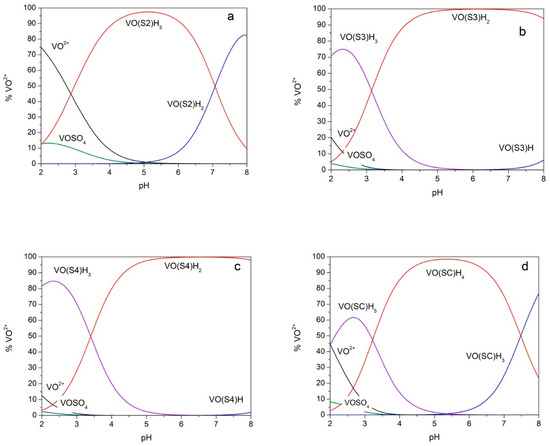 Species distribution diagrams. Species distribution diagrams for solutions of oxovanadium(IV) 5 mmolL−1 and ligand 10 mmol L−1 calculated on the basis of the formation constants reported in Table 1. (a) ligand = S2; (b) ligand = S3; (c) ligand = S4; (d) ligand = SC. VOSO4: Vanadyl–sulphate ion pair.