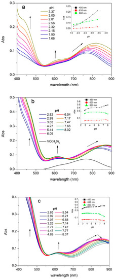 UV-vis absorption spectra. UV-vis absorption spectra of a solution containing oxovanadium(IV) 5 mmolL−1 and S2 5 mmolL−1 (batch titration) (a), S3 15 mmol L−1 (b), and SC 15 mmol L−1 (c). Inset graphs: Diagrams Abs vs. pH at different wavelengths.