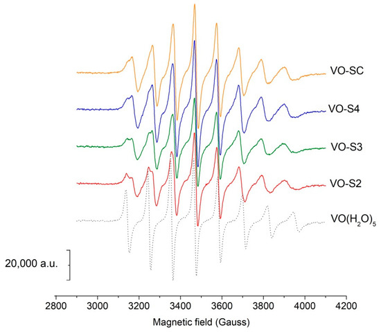 From inspection of the Table 4, it is quite evident that the ligands S3, S4, and SC replace equatorial water molecules of the pentaaquo oxovanadium cation with both the bidentate oxygen moieties of the ligands (CO, O−). The shifts on g and A values are those expected in the case of bidentate ligands, as those observed for β-diketonates, in which oxygen atoms are more covalently bound than water molecules, and therefore higher g‖ and lower A‖ values are expected [26,27,28]. The A‖ values approximately obey to the additivity relationship for equatorial ligands, as explained by Smith et al. [26], confirming the presence of four equatorial oxygen donors. Moreover, the values reported in Table 4 are in very good agreement with those proposed by Buglyò at al. [18] for the species VO(ka)2 (g‖ = 1.939; A‖ = 171 × 10−4 cm−1).