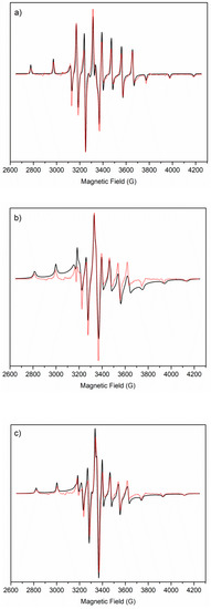 Anisotropic magnetic parameters of the LT EPR spectra were obtained by simulating the experimental spectra through a modified program from Pilbrow et al. [32], in which the line width (LW) parameters are allowed to vary according to the general formula LW = LW ± aMib, where a is a multiplication coefficient and b is an exponent of the nuclear magnetic component of the vanadium nucleus multiplet.
